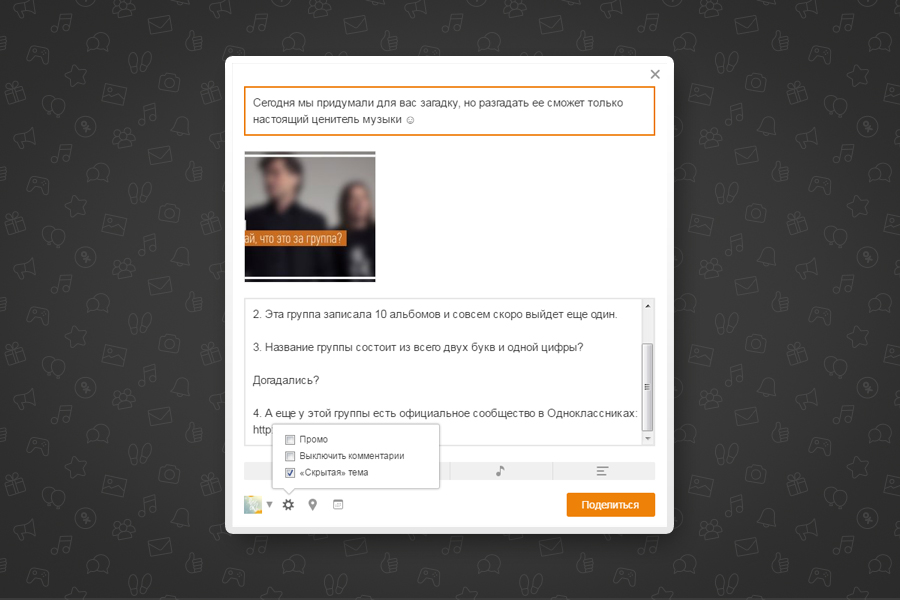 Одноклассники вводят скрытые темы — новый инструмент, который поможет в таргетированном продвижении групповых заметок в социальной сети. Выбирая этот пункт, администратор создаёт пост, который не виден участникам группы в ленте и темах, а отображается лишь для определенной категории пользователей, выбранной при продвижении поста. При этом «скрытая» тема доступна по ссылке, ей можно поделиться или поставить «Класс».