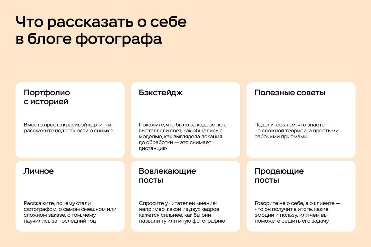 Личное. Искренняя история всегда находит отклик. Расскажите, почему стали фотографом, о самом смешном или сложном заказе, о том, чему научились за последний год. Это создаёт эмоциональную связь. Но будьте искренни — фальшь чувствуется сразу.