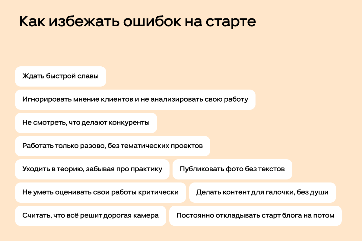 Постоянно откладывать старт блога на потом. «Вот куплю объектив…», «Вот начну проект летом…», «Вот сделаю красивый шапку профиля…». Это главная ошибка. Начинайте сейчас. С тем, что есть. Первые работы будут неидеальны, первые посты — неуклюжи. Но только начав, вы сможете исправлять ошибки и двигаться дальше. Идеального момента не будет.