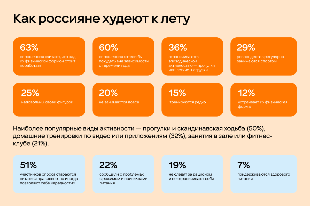 Говоря о способах похудения к летнему сезону, 31% опрошенных выбирают комплексный подход — сочетание физической активности и корректировки питания. Еще 28% планируют делать ставку на диету или ограничения в питании (например, дефицит калорий или отказ от сладкого), 9% — только на тренировки (кардио, силовые). Экспресс-методы (детокс, голодание, БАДы) рассматривают 2%.