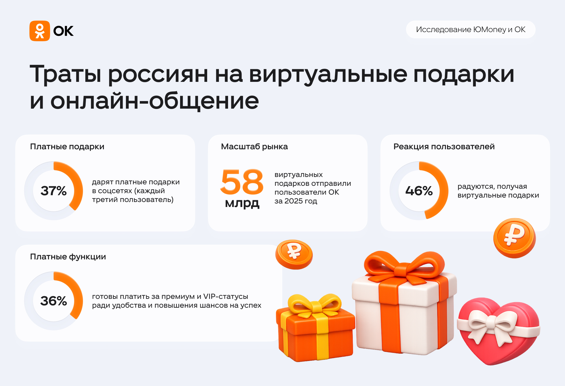 Большинство участников опроса позитивно воспринимают такие знаки внимания: 46% радуются, когда получают виртуальные подарки, 40% испытывают любопытство и интригу. 23% относятся к ним равнодушно, 19% — удивляются и испытывают неловкость. При этом только 16% обращают внимание на то, был подарок платным или нет.