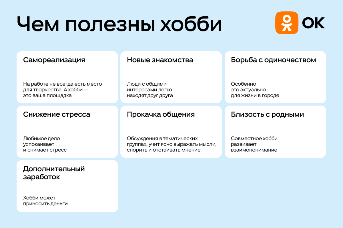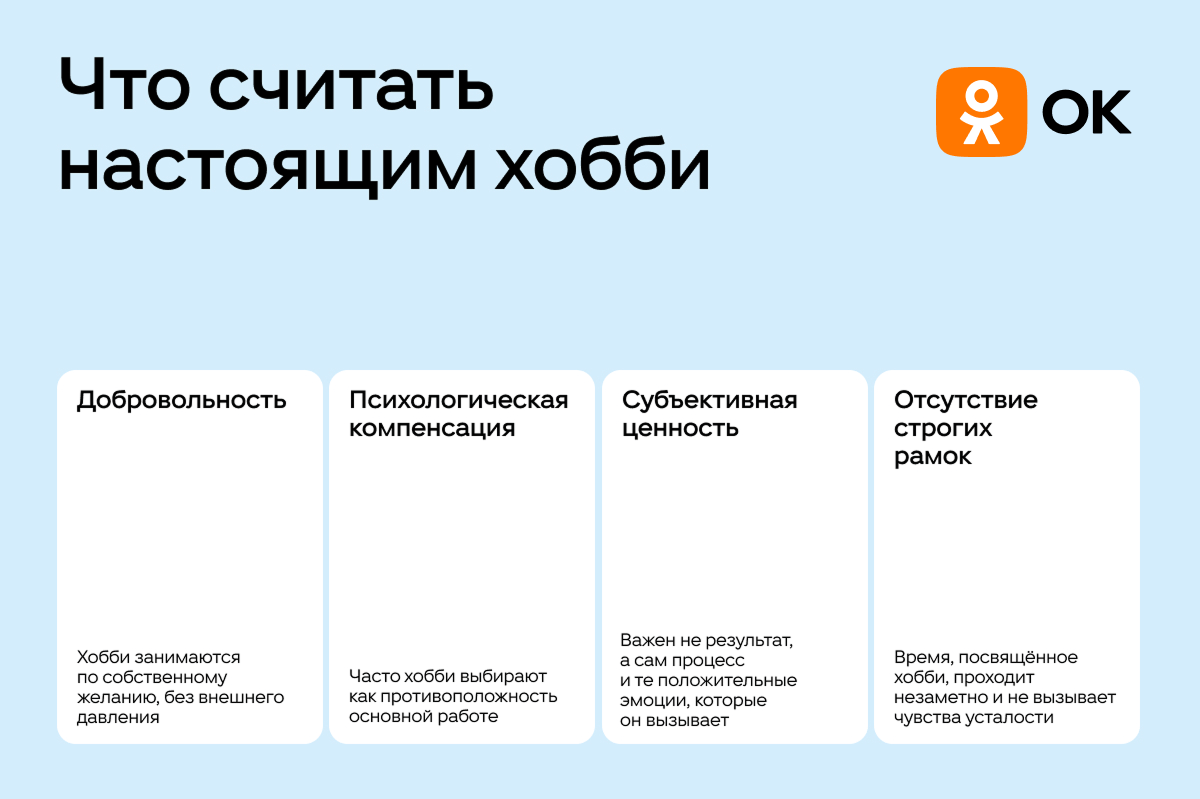 Основой для хобби могут стать любые ваши способности. Не бывает правильных или неправильных увлечений. Главное — чтобы вам нравилось и была возможность проявить себя. Хобби, которое даёт чувство востребованности, становится надёжной опорой для психического здоровья. Такой подход помогает увидеть в хобби не просто развлечение, а осознанный инструмент для улучшения жизни и работы.