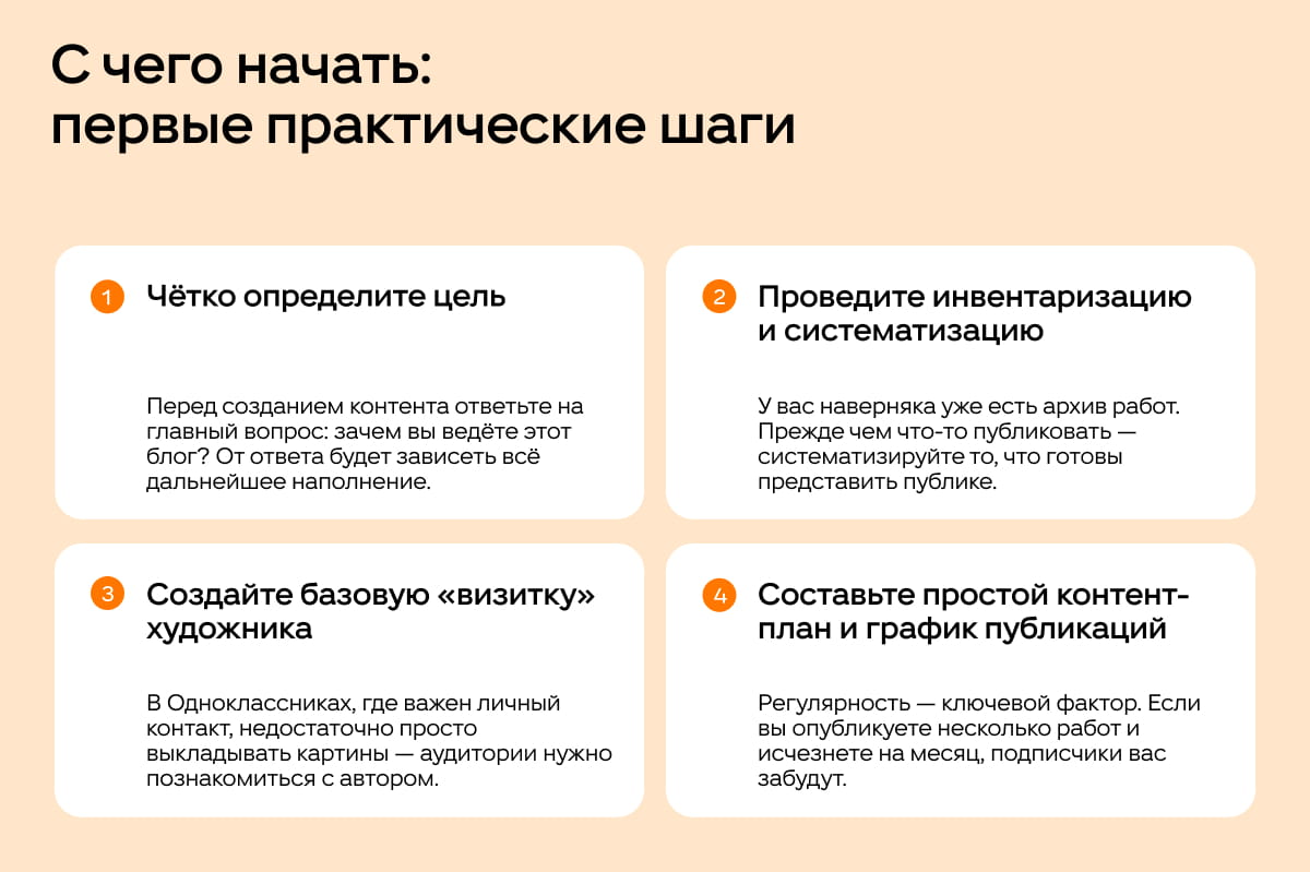 Эти шаги создают фундамент группы — они не требуют больших затрат, но дисциплинируют и помогают перейти от идеи к практике, избежав хаоса в публикациях.