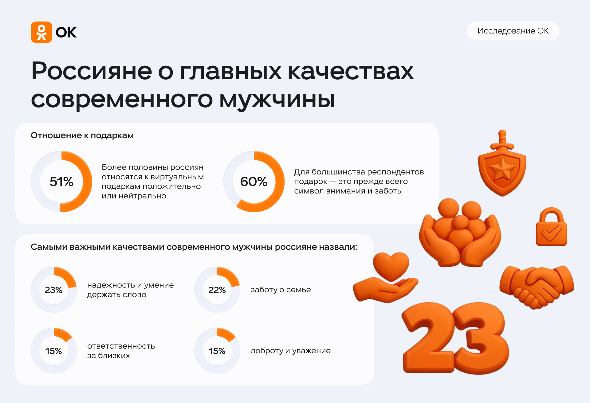 Одноклассники провели исследование среди своих пользователей и выяснили, какие качества современного мужчины они считают наиболее важными, какие ценности ставят на первое место и как относятся к подаркам на мужские праздники.