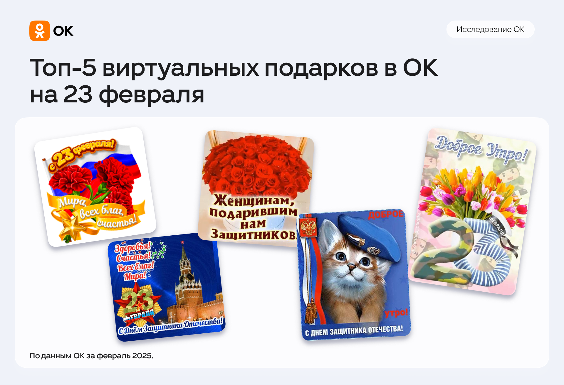Виртуальные подарки по‑прежнему остаются одним из самых востребованных сценариев поздравлений и социального взаимодействия: за 2025 год пользователи ОК отправили друг другу порядка 60 млрд виртуальных подарков. День защитника Отечества входит в топ-5 наиболее популярных дат, когда пользователи соцсети отправляют друг другу больше всего виртуальных поздравлений.